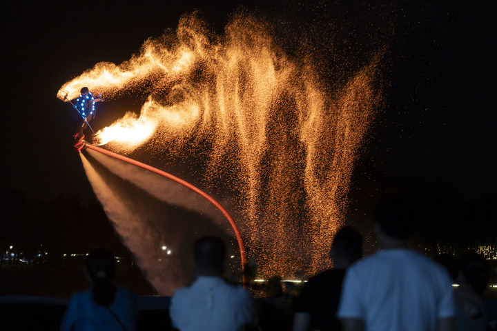 “水上飞人火壶秀”吸引了众多观众围观。摩托艇轰鸣声中,表演者脚踏高压水柱腾空而起,烈焰如两条赤龙破空狂舞。表演者凌空倒转,火流随身形划出熔金弧线,坠落的火星宛如银河倾泻。