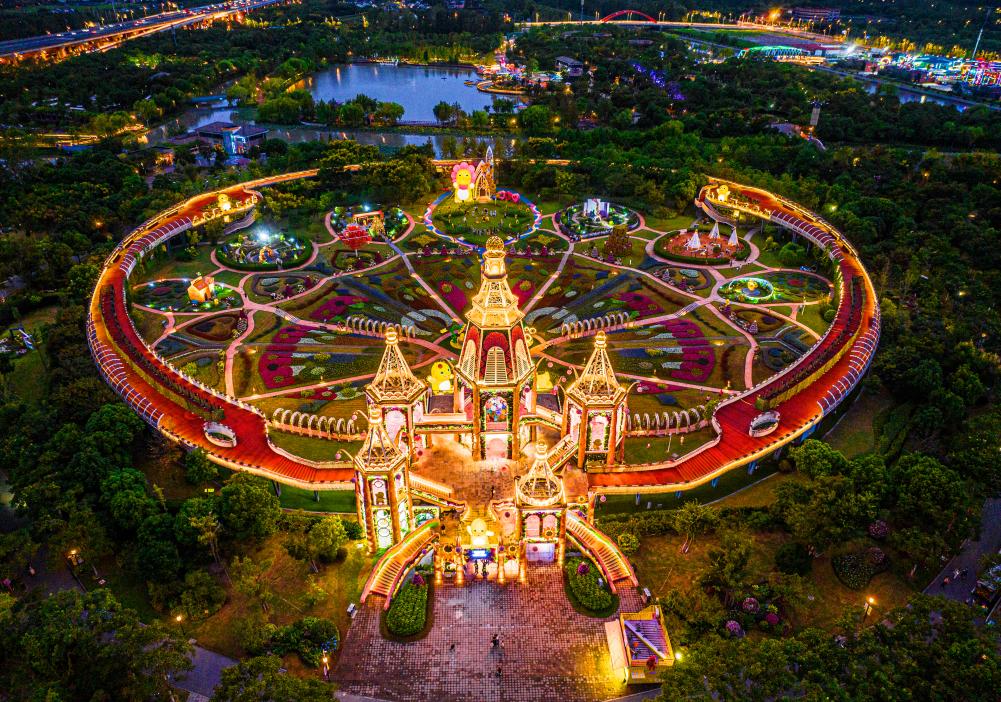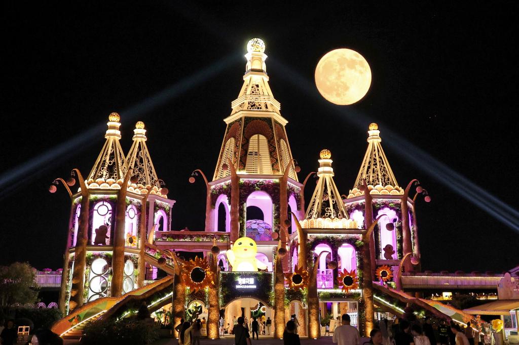 华灯初上,标志性建筑花精灵城堡在奇妙的光影变幻中熠熠生辉;奇迹花园中心区域的非遗特色烟火秀流光溢彩;静湖湖面上的“奶龙”动画水幕电影正精彩上映……