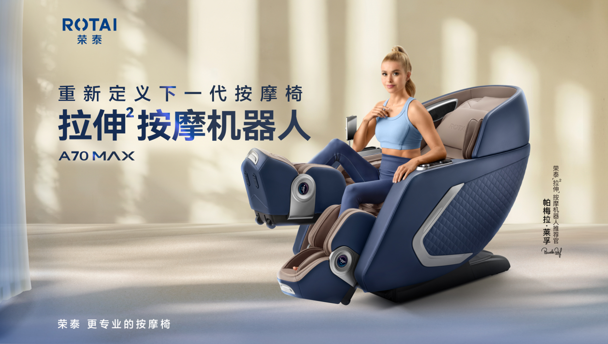 荣泰健康以“按摩机器人”为新赛道,推动产品从单一按摩工具向智能化健康伙伴转型。今年发布的旗舰新品——荣泰拉伸²按摩机器人A70Max,搭载自主研发的Bi-Stretch拉伸²系统,通过单腿拉伸带动全身肌肉协同舒展,实现媲美专业康复理疗师手法的深度拉伸。该产品融合了“双机芯”“柔性导轨”等专利技术,可精准作用于髂腰肌、梨状肌等深层肌群,配合160°柔性导轨与上下双芯四手联控按摩,模拟专业理疗师的复合手法。