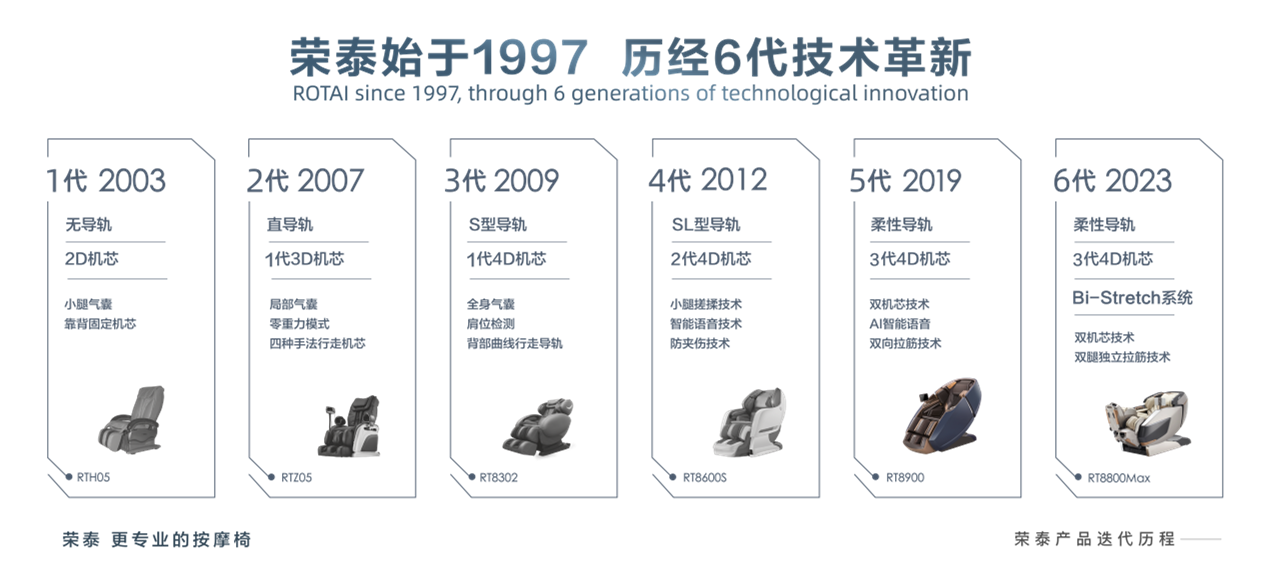 历经了6次重大技术迭代,荣泰健康在按摩导轨上实现了从无导轨到S型、SL型,再到更贴合人体曲线的“柔性导轨”的进化;在按摩机芯上完成了从2D、3D到4D机芯,再到“双机芯”的跃升;升级腿足按摩体验,推出360°玲珑腿足系统及Bi-Stretch拉伸²系统,开创机器人分离式腿足拉伸新体验。