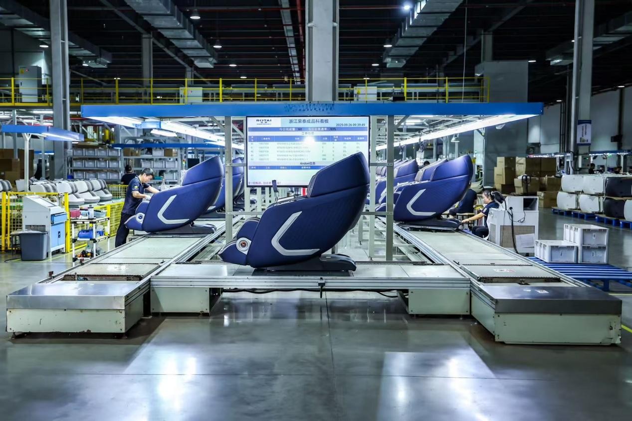 从“制造”到“智造”,荣泰健康不断探索制造业的智能变革,在上海朱家角、浙江南浔、泰国素万那普布局三大智能产业园,年设计总产能超过50万台,构建起覆盖东亚、北美、欧洲的全球化供应链网络。其中,总投资4.48亿元、占地76亩的南浔智慧工厂作为荣泰自动化水平最高的生产基地,通过MES、WMS等系统实现全流程数字化管理,构建了从设计研发、质量检测到运输仓储的全流程数字闭环。