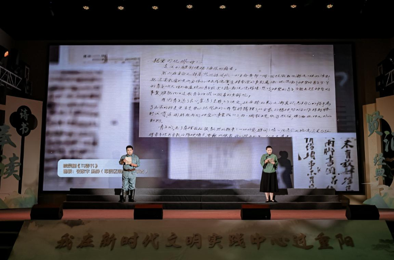 随后的“重阳・敬老”篇章,尽显温情与厚重。新老选手罗恩雷、高文山、梁大为连诵《九月九日忆山东兄弟》等经典诗作,以声音回溯千年情怀。上海电影译制厂一级演员丁建华带来《采桑子・重阳》,赋予了伟人诗篇新的生命律动。来自奉贤的“全国文明家庭”代表周忠尉,深情诵读原创诗歌《我有一所房子》,朴素的字里行间流淌着寻常小家最珍贵的温情与坚守。而由奉贤区南桥镇的诵读者张欣宇、汤静带来情景剧《与妻书》,将展演推向情感的高潮。该剧以入选首批“上海市珍贵红色档案名录”的《沈志昂烈士家书》为蓝本,剧情叩击人心、激荡家国情怀,让传统美德与革命精神在情感共鸣中实现同频共振。