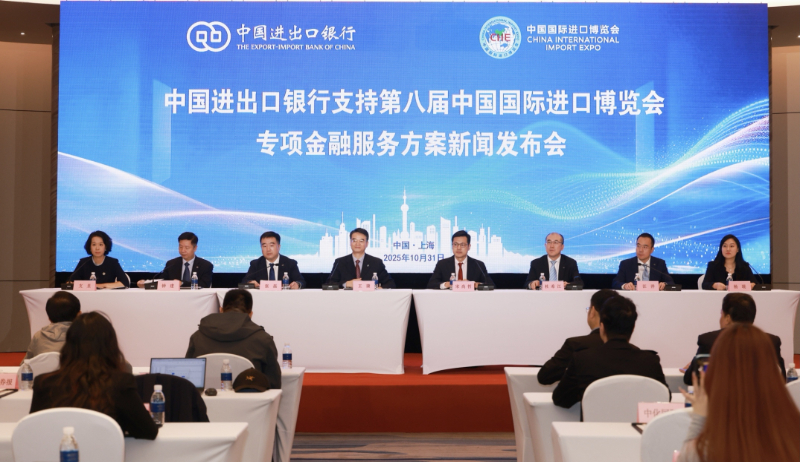 10月31日,中国进出口银行联合中国国际进口博览局在上海召开新闻发布会,发布为第八届中国国际进口博览会(以下简称进博会)量身定制的“智融全球2025”专项金融服务方案。进出口银行副行长王康,进博局宋尚哲出席发布会并致辞,双方共同为专项金融服务方案发布揭牌。