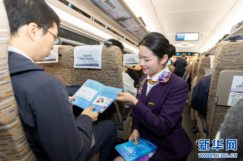 10月30日,上海客运段列车员在车厢内为旅客派发进博宣传册,介绍进博会亮点。