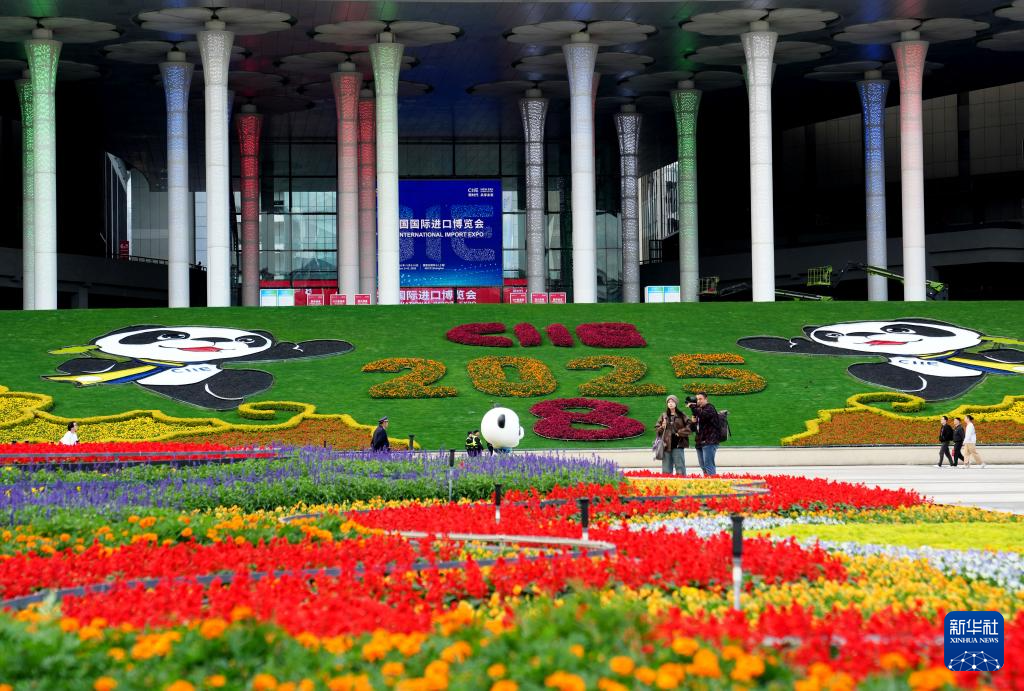 10月29日拍摄的国家会展中心(上海)周边的进博会标志。