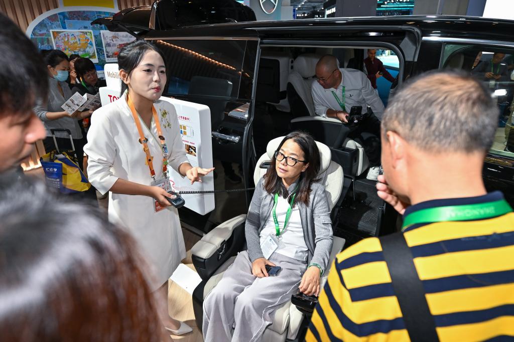 11月8日,在第八届进博会汽车及智慧出行展区丰田展位,观众在体验一款福祉车。这款福祉车搭载电动升降旋转座椅,便于肢体障碍人士乘车。