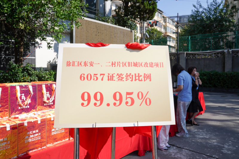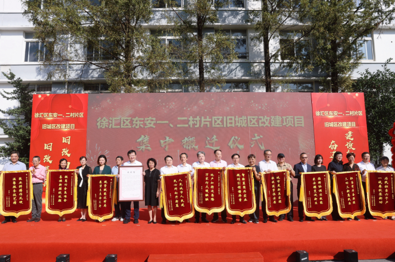仪式现场,上海地产(集团)有限公司党委书记、董事长黄永平和徐汇区委书记曹立强共同揭牌签约比例。为表达感谢之情、感激之心,东安一、二村的居民群众向中共徐汇区委、徐汇区人民政府送出感谢信,向上海市规划和自然资源局、上海市住房和城乡建设管理委员会、上海市房屋管理局、上海地产(集团)有限公司、徐汇区房屋征收指挥部、徐汇区规划和自然资源局、徐汇区建设和管理委员会、徐汇区住房保障和房屋管理局、徐汇区枫林街道党工委、办事处、徐汇城投集团送上锦旗。现场的市、区领导也向居民送出乔迁大礼包。居民群众纷纷与领导合影留念,共同记录这历史性的幸福美好一刻。