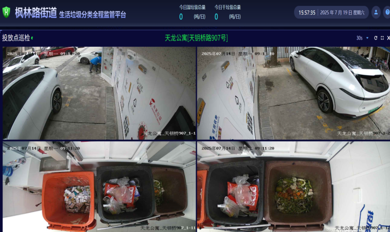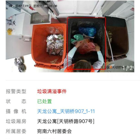 目前,天龙公寓生活垃圾库房现已部署垃圾分类智能可视化监管系统。该系统通过智能预警设备和在线监控平台,构建了“源头识别-智能预警-及时整改”的完整监测闭环,实现信息可回溯、可查询、结果可反馈、全程可跟踪。智能可视化监管系统不仅能自动取证、实时反馈,更能依托智能语音配置进行“云劝导”,在实时监控与识别过程中自动提醒居民正确分类,有效提升居民垃圾分类意识,引导其自觉履行分类责任与义务,养成精准投放习惯。