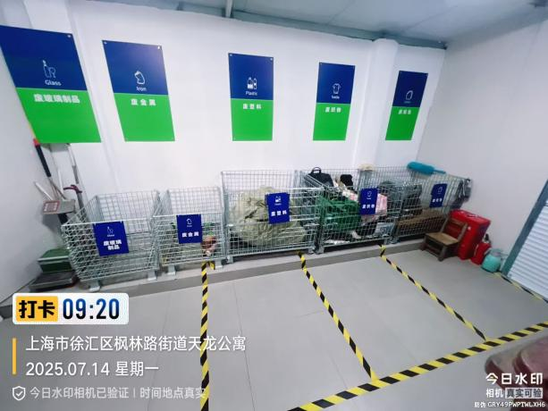 此前,由于天龙公寓内可回收物量较大,存在可回收物堆积较多且杂乱情况,为此,结合精品小区创建工作,在生活垃圾投放点设置了“沪尚回收”可回收物固定型服务点,能为周边居民提供可回收物交投服务,点位内设有可回收物精细化分类容器,包括玻璃、金属、塑料、纸张、织物五大品类,并设有公示牌,明确了回收人员及单位、回收价格、回收种类、服务时间等信息,服务点的设立进一步提升了居民区内可回收物精细化管理水平。