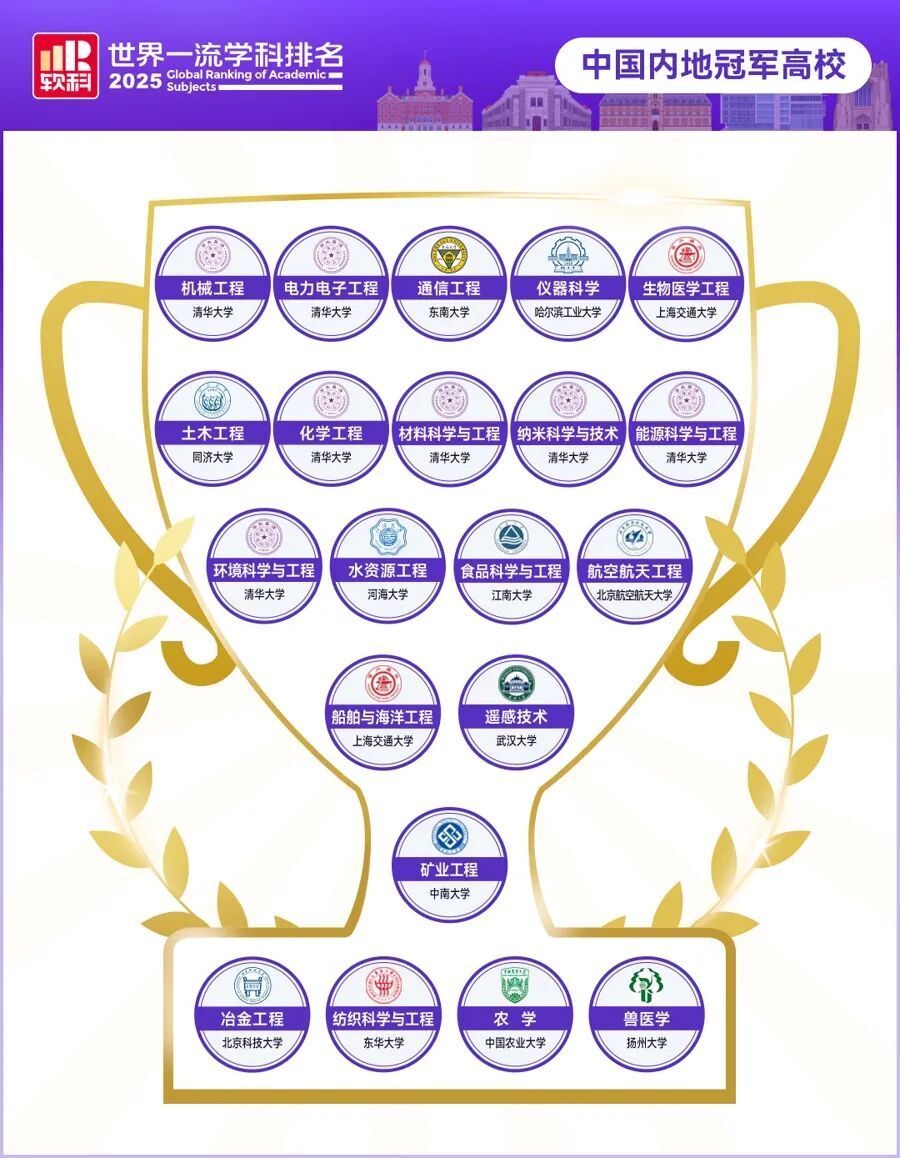 这些“世界一流”中的冠军学科,分别是清华大学(机械工程、电力电子工程、化学工程、材料科学与工程、纳米科学与技术、能源科学与工程、环境科学与工程)、上海交通大学(生物医学工程、船舶与海洋工程)、东南大学(通信工程)、哈尔滨工业大学(仪器科学)、同济大学(土木工程)、河海大学(水资源工程)、江南大学(食品科学与工程)、北京航空航天大学(航空航天工程)、武汉大学(遥感技术)、中南大学(矿业工程)、北京科技大学(冶金工程)、东华大学(纺织科学与工程)、中国农业大学(农学)、扬州大学(兽医学)。其中,扬州大学首次拥有全球冠军。