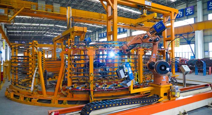 走进生产基地,智能化气息扑面而来。在钢筋加工车间,“钢筋骨架智能化成型装备”有序运转,通过集成创新与视觉识别技术,实现从上料、剪切、弯弧、焊接的全流程自动化,自动化率高达90%,每半小时即可完成一个钢筋骨架。焊接环节搭载焊接机器人,采用AI视觉与激光跟踪技术,实现实时纠偏、自动调整,从根本上保障了产品质量。