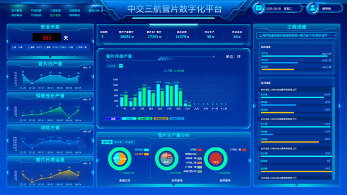南通海洋公司坚持以自主创新和绿色低碳为双引擎,持续推进科技赋能与管理数字化,全方位提升生产的高端化、智能化、绿色化水平。采用国产软件与终端设备,构建自主可控的管片生产数字化平台,整合APS、MES、QMS等系统,依托物联网与大数据实现全流程协同管控。屋顶光伏年发电超300万千瓦时,节约电费逾30万元,碳排放降低7%;配合养护水循环和变频振捣等技术,真正实现节能降耗与高效生产并行。