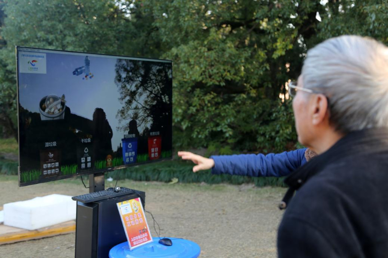 植物园游客体验垃圾分类体感游戏(市总队供图)