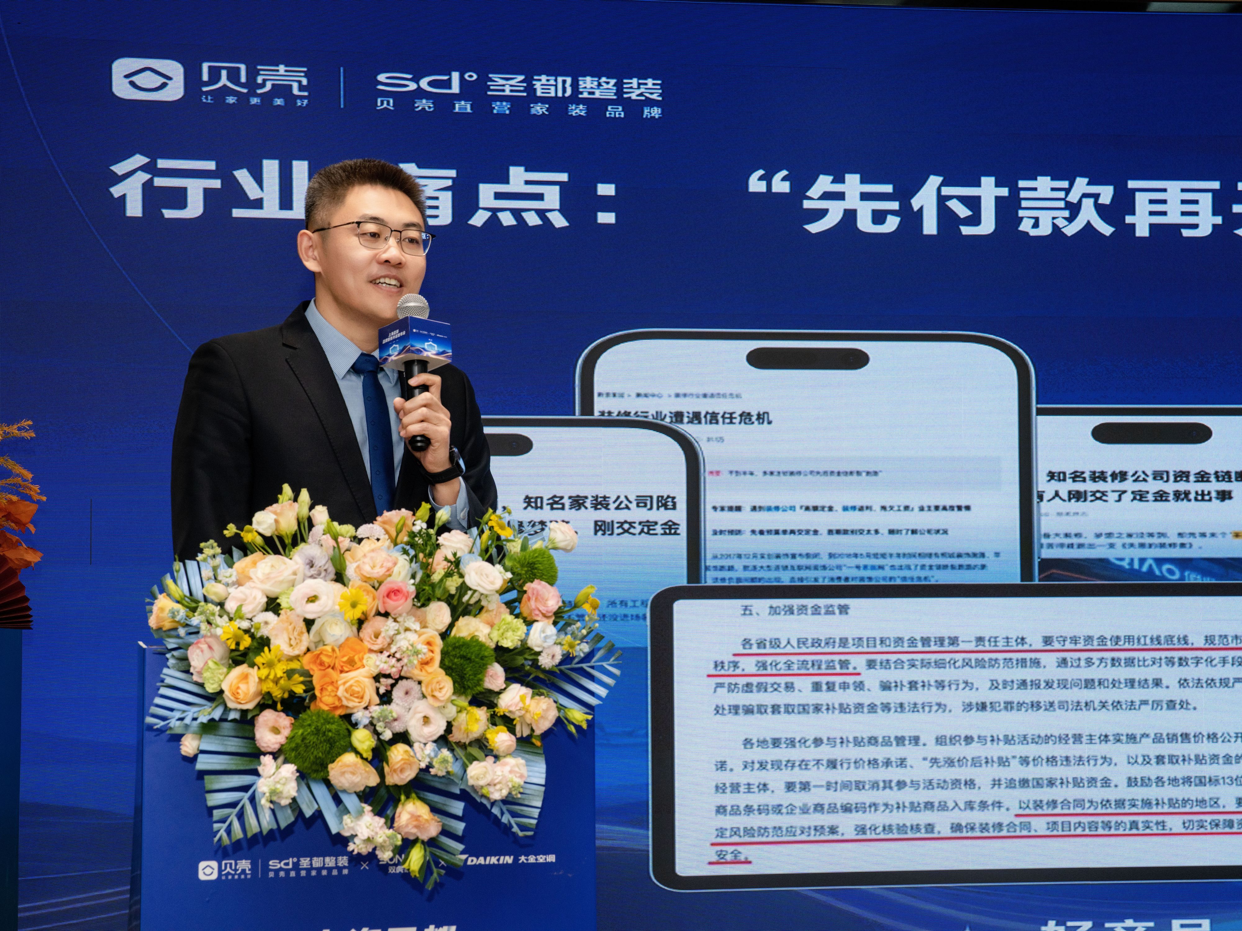 在发布会现场,贝壳整装对外关系与发展中心总经理郑深圳在发言中系统性阐述了资金存管服务的核心价值。他介绍到,资金存管在形式上是一项服务,但本质上是构建与消费者的信任纽带,其“满意再付款”的朴素理念直击装修行业预付模式下的资金风险痛点。郑深圳指出,贝壳之所以能率先在家装领域推行此项服务,源于其“对客户好”的基因与在居住领域积累的深厚能力。他强调,推行资金存管的核心在于“将选择权交还给消费者”,这不仅是企业服务的创新,更是推动行业建立基本信任线、走向规范透明的重要实践。