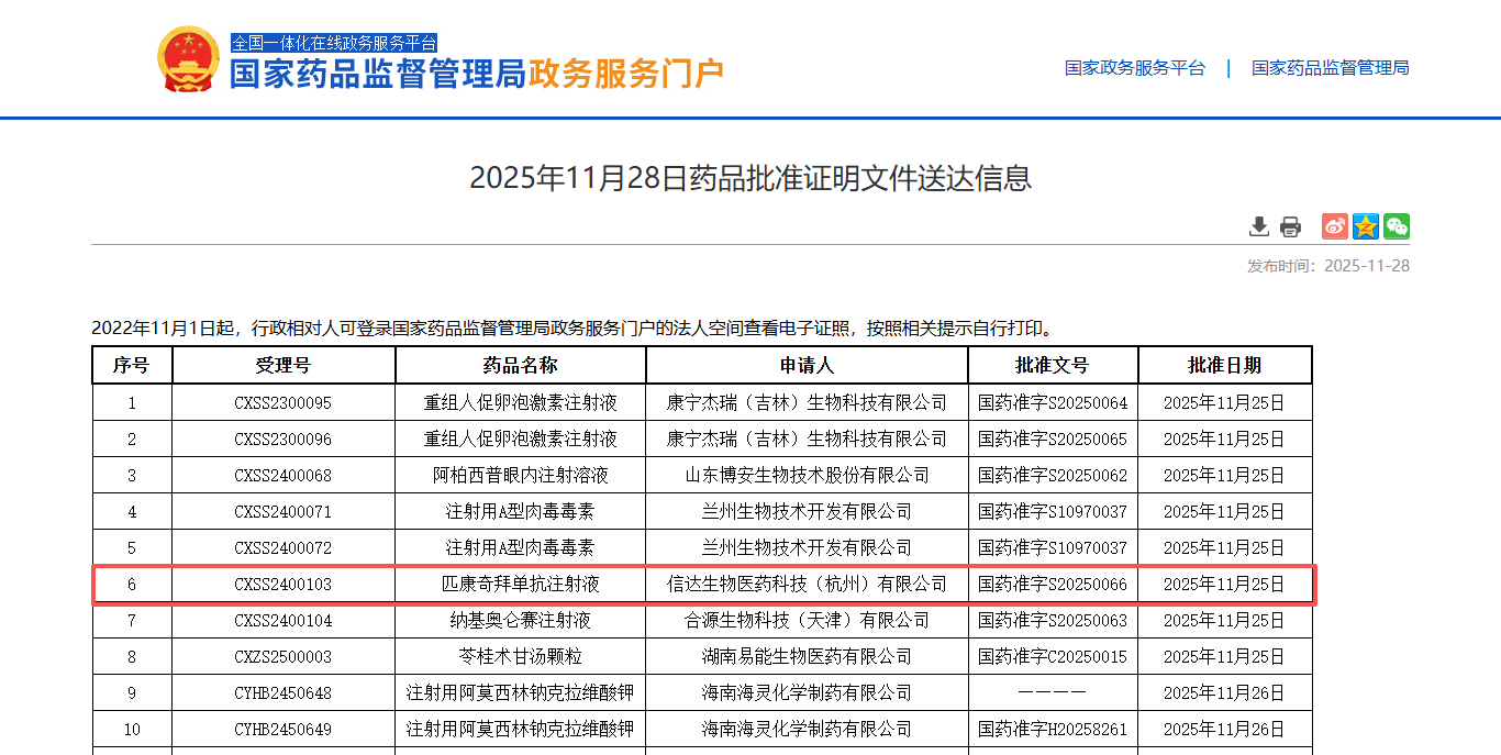 11月28日,国家药品监督管理局(NMPA)官网发布消息,信达生物制药集团自主研发的信美悦(匹康奇拜单抗注射液)获批,用于适合系统治疗的中重度斑块状银屑病成年患者。