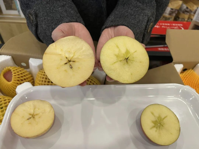 工作人员展示冰糖心苹果(右侧)与普通苹果(左侧)的区别