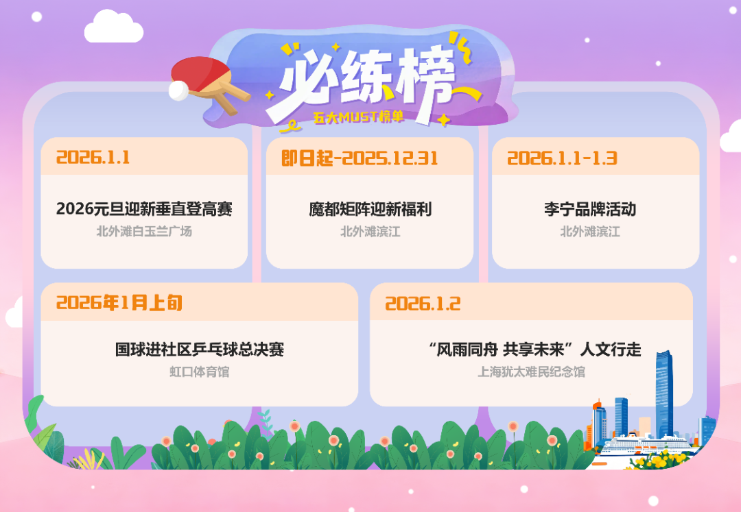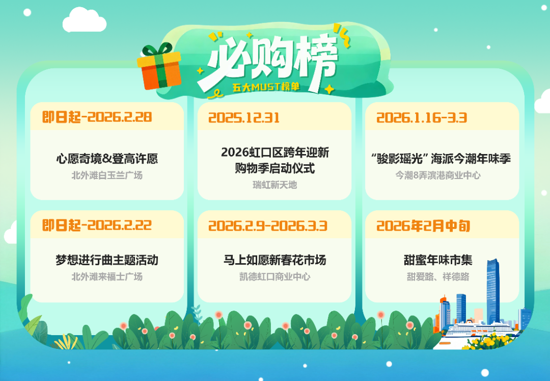 岁末年味浓,虹口福利已就位!2026年一季度,“乐购乐游”迎新季重磅来袭,瑞虹新天地、上海白玉兰广场等五大核心商圈联手北外滩滨江消费带,狂甩66场特色活动,从跨年派对到新春市集,从艺术盛宴到冰雪狂欢,吃喝玩乐购一站式解锁,让“年在上海,乐在虹口”成为这个冬天的专属记忆。