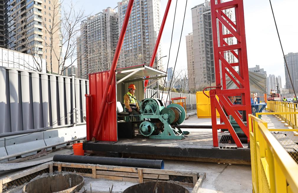 工人在南北通道浦西段四平路工作井施工现场调试运行工程机械(2025年12月30日摄)。