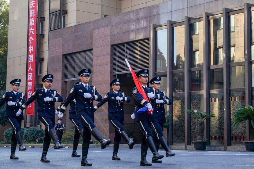 上午9时,仪式正式开始。英姿飒爽的护旗队员迈着铿锵有力的正步,护卫着中国人民警察警旗行进至升旗台。伴随着雄壮的《中国人民警察警歌》,红蓝相间的警旗冉冉升起,迎风飘扬。全体民警整齐列队,面向警旗庄严敬礼,表达对党和人民的无限忠诚与对公安事业的无限热爱。