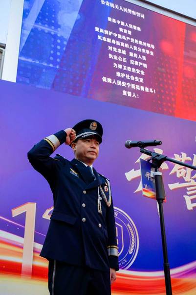 “我是中国人民警察,我宣誓!”在领誓人带领下,全体民警高举右拳,重温入警誓词。铮铮誓言响彻云霄,彰显了奉贤公安牢记宗旨使命、勇于担当作为的坚定决心。