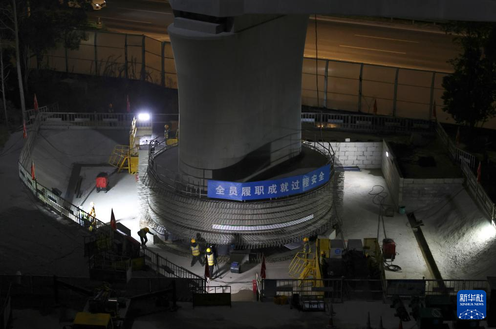 1月8日,一列磁悬浮列车(右下)从川沙特大桥跨磁悬浮连续梁转体施工现场驶过。