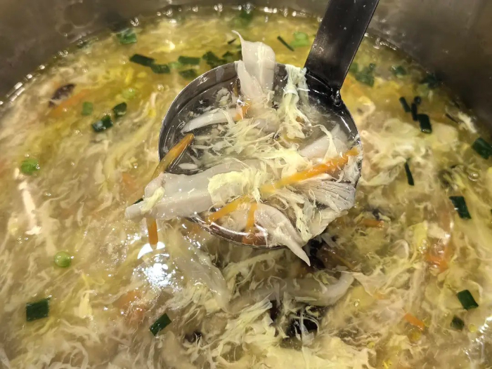 1月20日,距离午餐开餐还有一个半小时,饭堂后厨已是一片热气腾腾的忙碌景象。大锅里翻滚着金黄的汤汁,浓郁的香气弥漫在整个空间。“我们每天早晨6点半就开始煮了。”食堂厨师陈国民一边查看火候一边介绍,“上午煮两锅,下午再煮两到三锅,算下来一天要炖四到五锅,每锅差不多用十只鸡。”为了保证汤品质量,特意选用了养殖周期更长的南汇散养鸡,并在鸡汤基础上加入了平菇、胡萝卜、木耳和鸡蛋液等,来丰富这碗汤的营养和口感,“胡萝卜能增加维生素,色彩也好看,食材丰富了,口感更鲜。”