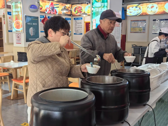 上午11点,饭堂准时开餐。取餐窗口旁的餐台上,三大桶鸡汤热气腾腾,居民们熟练地取碗、盛汤。与此同时,三鲜砂锅、酸菜鱼砂锅等冒着热气的冬日菜品,也成了驱寒饱腹的热门选择。