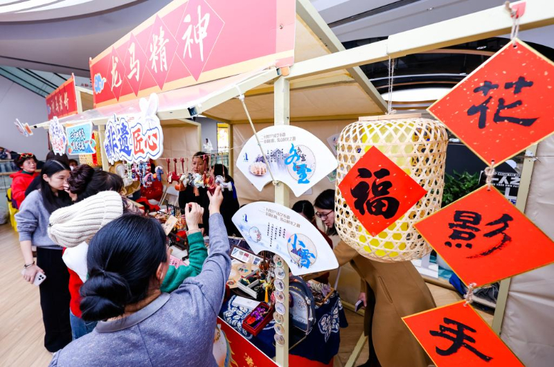 在非遗技艺体验区内,马年专属非遗项目让市民深度感受传统文化的魅力。观缘文创的“平安甲马”拓印备受青睐,改良后的云南非遗木刻版画成为热门新春信物;还有梅陇花影社皮影,罗阳八居的“福马”剪纸、马主题钩针、盘扣等,更是尽显匠心。
