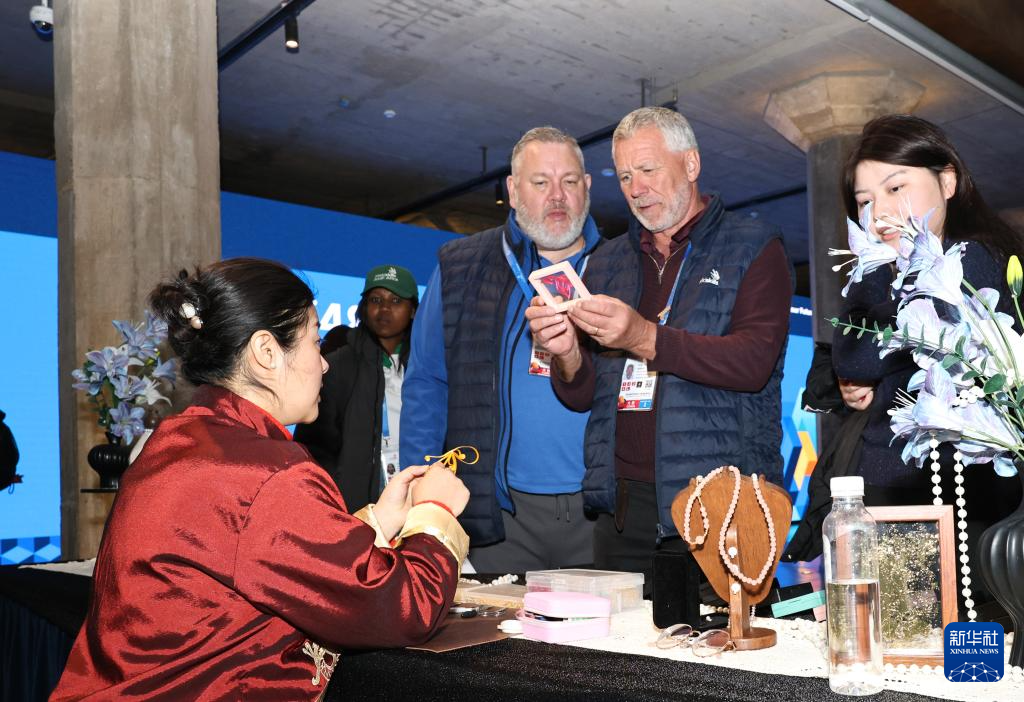 2月4日,嘉宾在世界技能博物馆非遗展台观看传统盘扣工艺品。