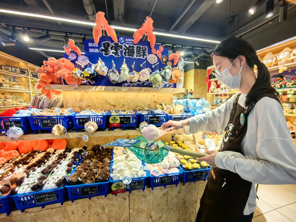 “今天的海胆很新鲜,要不要入手一只?”店员一边说,一边用渔网“捕捞”着。这样的对话并不发生在菜市场,而是在“动物星云”ZX创趣场门店内。海胆、龙虾、牡蛎、扇贝等被做成了可爱的毛绒玩具,放置在塑料筐中“捕捞”后交付给消费者,提供沉浸式购买体验。