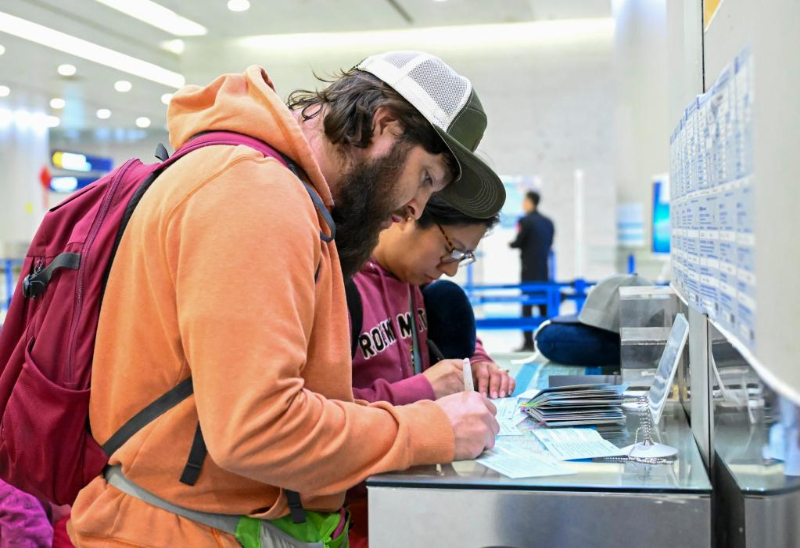 2月11日,外国游客在上海浦东国际机场口岸填写入境信息。