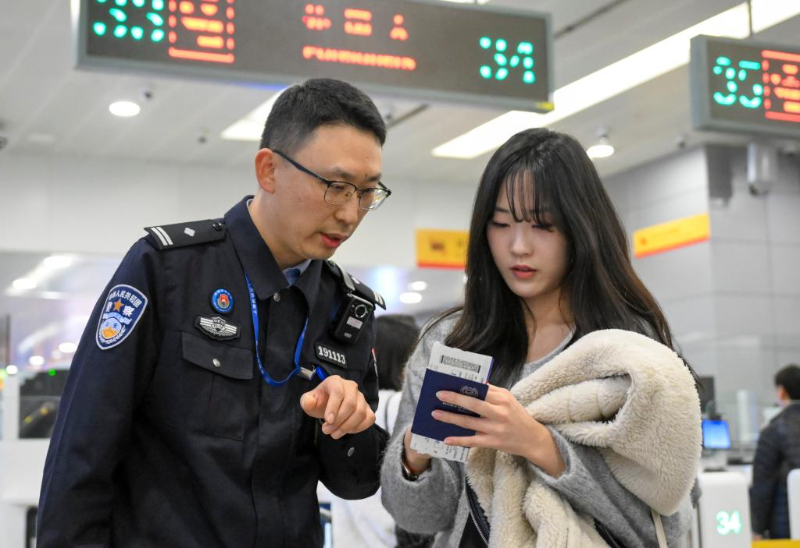 2月11日,在上海浦东国际机场口岸,边检民警帮助韩国游客填写入境信息。