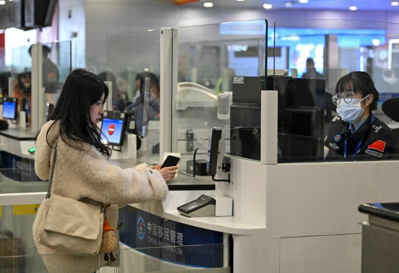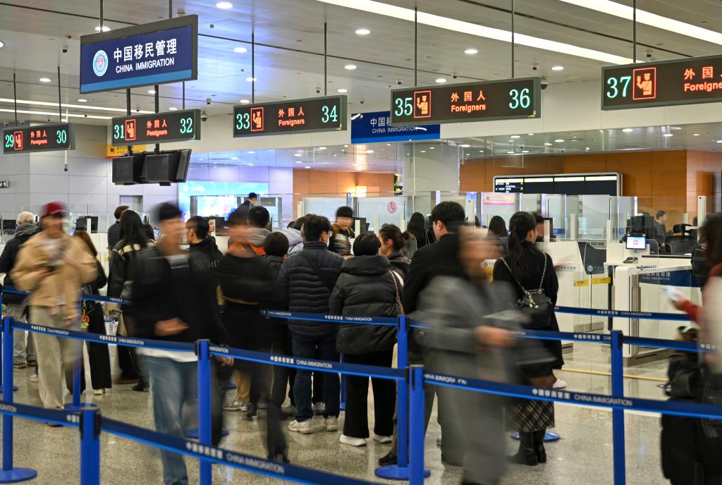 2月11日,游客在上海浦东国际机场口岸办理通关入境手续。