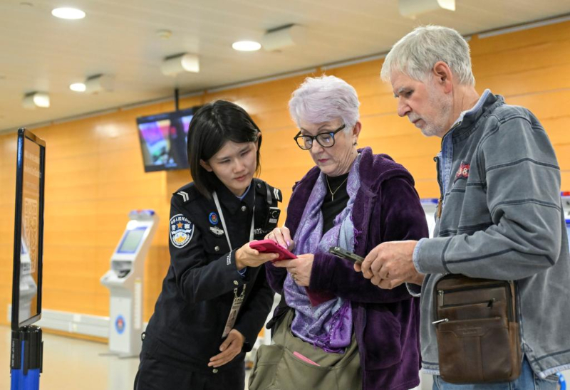 2月11日,在上海浦东国际机场口岸,边检民警帮助外国游客填写入境信息。