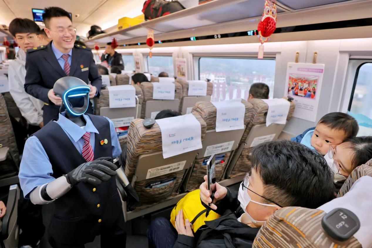 今年春运途中,新技术的投用更让旅客们惊喜连连,深感便利和温暖。在“西子号”列车上,“编外乘务员”机器人“福兴”为旅客查询列车时刻、换乘路线,它还与旅客互动,提供到站天气、旅游景点等信息。从上海回宁波的方女士和它握了握手,感慨说:“春运回家路上很惊喜,科技发展越来越融入我们的生活。”