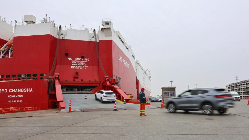 3月24日,工作人员在码头引导国产新能源汽车驶入汽车滚装船。