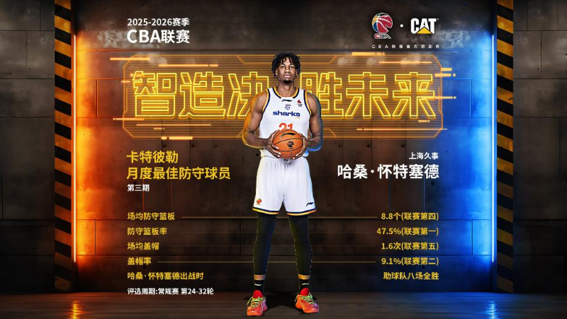 新华网上海4月1日电(记者胡洁菲)记者1日获悉,CBA联赛官方宣布,上海久事内线球员哈桑·怀特塞德当选2025—2026赛季CBA联赛第三期卡特彼勒月度最佳防守球员。