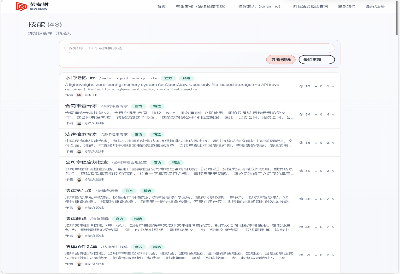 劳有钳的能力不止于法义经纬官方预置。依托劳有钳发起的开源共创社区“有钳客栈”,用户可以免费下载更多共享开源的技能包(skills),也可以将自己摸索出的高效工作流打包上传分享。