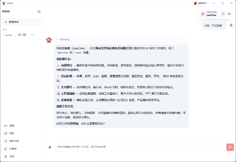 劳有钳基于全球现象级开源项目OpenClaw开发定制,其名取自“Law”的谐音,寓意让法律人的劳动拥有真正的“抓手”——像龙虾般敏捷执行。劳有钳摒弃传统云端AI模式,直接在用户电脑本地运行,不仅保留了OpenClaw的强大运行机制,更针对中国法律实务进行了优化加固,简化安装与配置流程,预装专业法律技能,让法律人无需复杂调试,即可快速拥有一位成熟高效的AI助手。