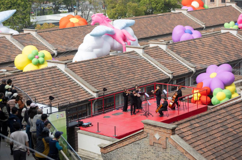 4月4日,第41届“上海之春”文艺轻骑兵惠民行虹口专场首场演出在“滨港商业中心今潮8弄”启幕。俄罗斯莫斯科国立柴可夫斯基音乐学院独奏家室内乐团来到百年弄堂屋顶演奏,为市民呈现沉浸式艺术盛宴。