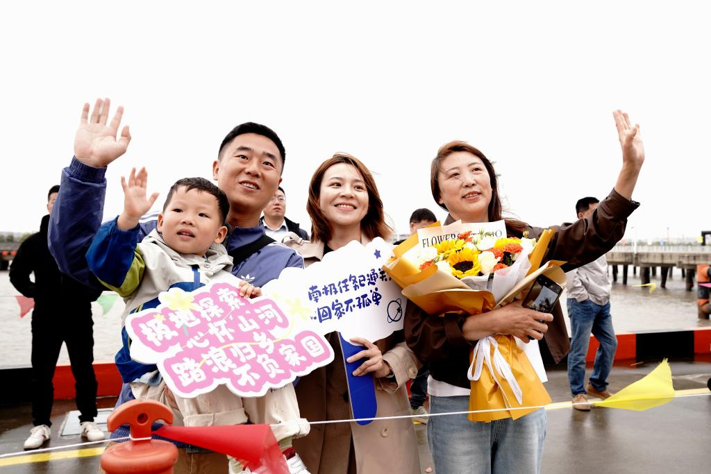 4月9日,中国第42次南极考察队队员(左)与家人团聚。