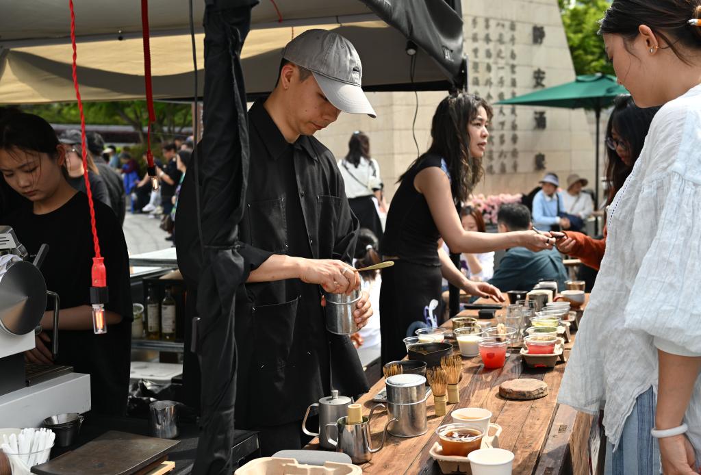 4月9日,人们在上海丰盛里·静安寺广场的咖啡文化市集上购买特色咖啡。