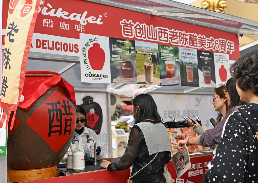 4月9日,人们在上海丰盛里·静安寺广场的咖啡文化市集上购买特色咖啡。