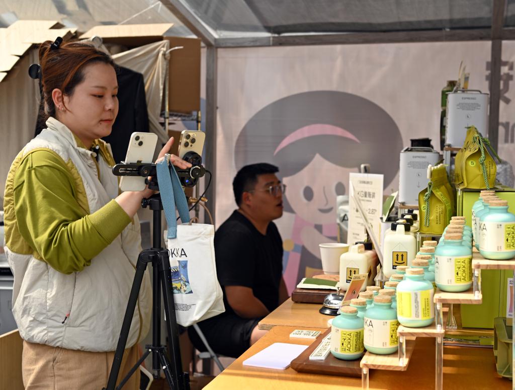 4月9日,在上海丰盛里·静安寺广场的咖啡文化市集上,咖啡品牌的工作人员直播卖货。