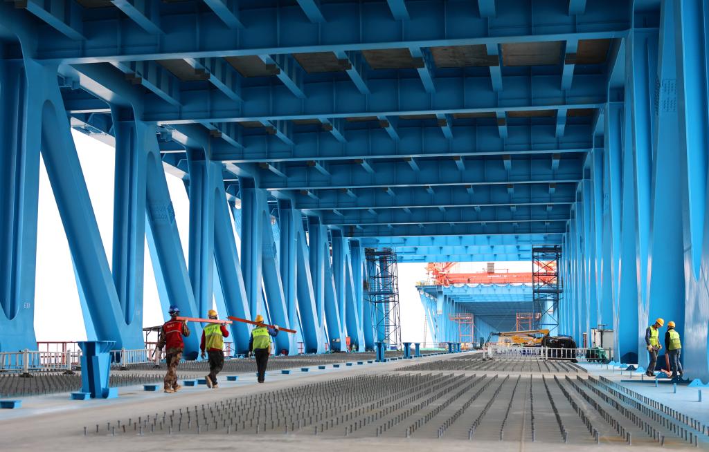 4月16日,工人在崇启公铁长江大桥公路作业面操作架板机进行公路桥面板铺设。