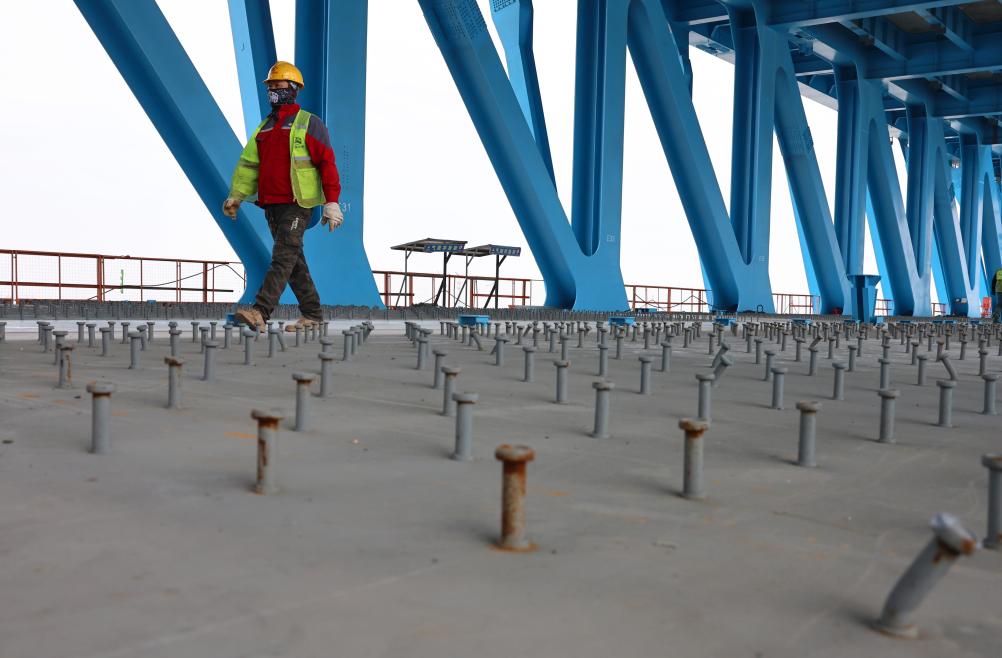 4月16日,一名工人走在崇启公铁长江大桥铁路作业面施工现场。