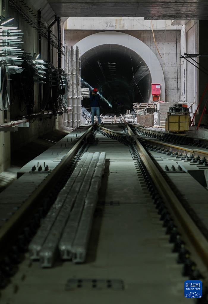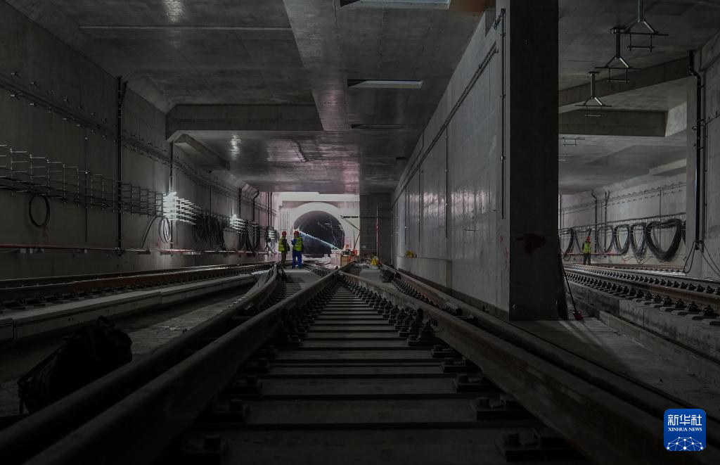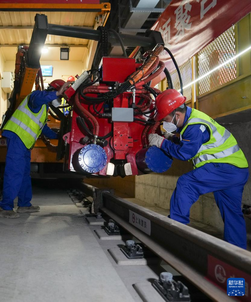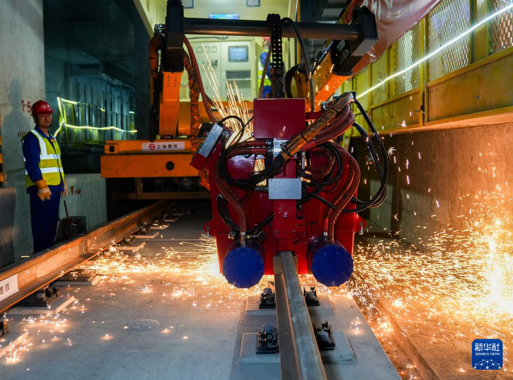 4月21日,在上海市崇明区陈家镇站内,中铁五局作业人员在进行最后一对钢轨接头焊接。