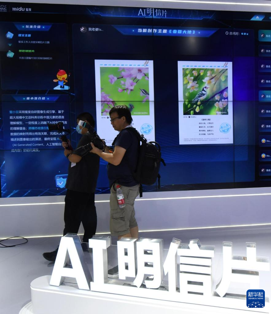 7月5日,两名记者在一家厂商展位拍摄“AI明信片”。