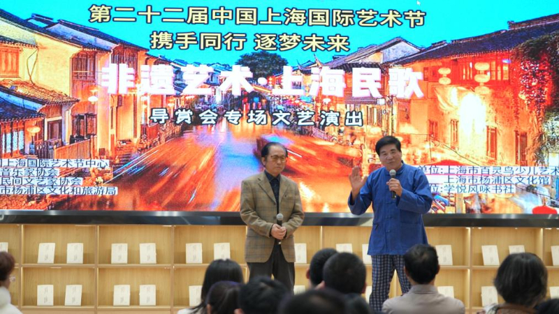 近日,作为正在举办的第二十二届中国上海国际艺术节的系列活动之一,一场上海民歌导赏活动在上海杨浦区学悦风咏书社举办。现场观众随着非物质文化遗产保护工作专家的讲解,欣赏着一首首动听的歌曲。
