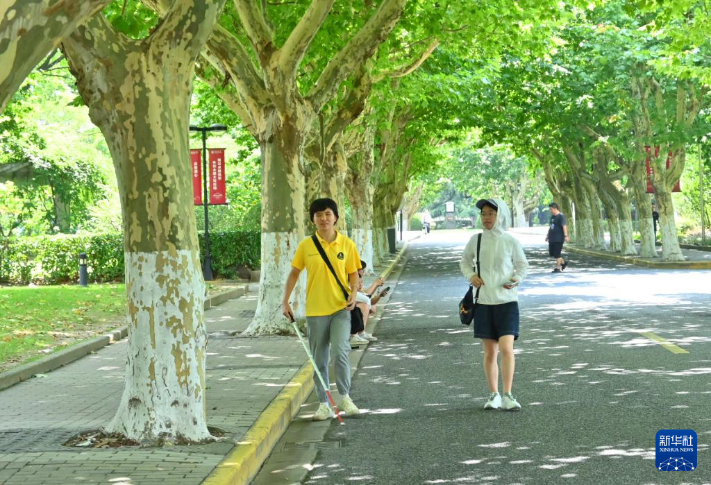 学员彭香香(左)在志愿者跟随下进行盲杖独立出行训练(7月31日摄)。